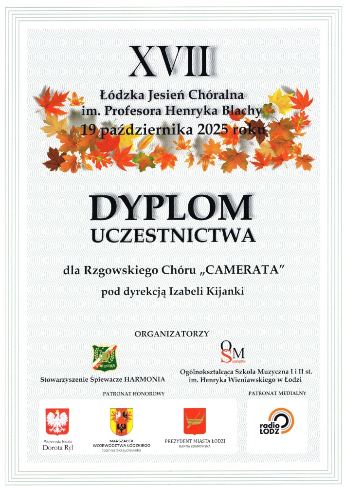 XVII Łódzka Jesień Chóralna im. prof. Henryka Blachy – to było naprawdę znakomite wydarzenie! Czternaście chórów regionu łódzkiego (z Łodzi, Kutna, Kalonki Aleksandrowa Łódzkiego, Rzgowa)wystąpiło w koncercie festiwalowym w w niedzielę 19 października 2025 roku w Sali Koncertowej im. A Rubinsteina Ogólnokształcącej Szkoły Muzycznej I i II st. im H. Wieniawskiego przy ul. Sosnowej 9 w Łodzi, na zaproszenie organizatorów - Stowarzyszenia Śpiewaczego „Harmonia” i OSM Sosnowa.
